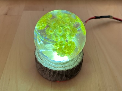 木材を切削して作ったライト付き台です。ドライフラワーを使ったクリスタルレジンを綺麗に見せるためのもので、触れる事でライトがオンオフします。
