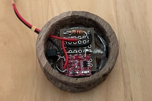 本当はボタン電池を入れたかったのに深さ足らんかった^^;。木片の切削は、ドリルで外堀掘って、彫刻刀で掘っていくアナログ工作。昔、友人と共同で中華CNC買ったんですけどね。結局、不具合がでてモノにならず、転勤した友人宅で眠っています。またやりたい。。。