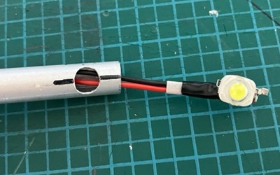 そのあと接着剤で留めてるんですが、このクサビには固定以外にも役割があって、それはLEDの熱をパイプに伝える役割です。このLEDは消費電力1Wで、かなり熱くなるのでヒートシンクが必要なのですが、パイプがその機能を果たすようにしたかったのです。むしろ固定はおまけ。