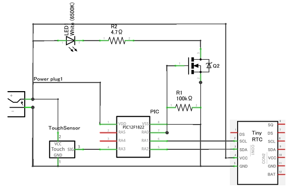 PICで、タッチセンサの出力とRTCからの時刻をチェックして、LEDをオンオフします。