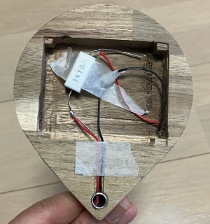 裏はエンドミルで外堀を掘って、彫刻刀で掘っていくという力技。7cm×5cmのユニバーサル基盤が入ります。今は抵抗をつけているだけ。